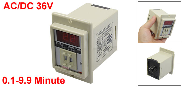 DetailsWhite AC/DC 36V Power on Delay Timer Time Relay 0.1-9.9 Minute 8 Pins ASY-2D  Product Name Digital Time Relay Type ASY-2D Rated Voltage AC/DC 36V Frequency 50/60 Hz Contact AC 220V 5A Non-inductive Load Time Range 0.1-9.9 Minute Mount Size (Approx.) 49 x 68 x 61mm/ 1.9" x 2.7" x 2.4" (L*W*H) Mount Hole Diameter 4mm/ 0.16" Total Size 57 x 90 x 86mm/2.2" x 3.5" x 3.4"(L*W*H) Color White Net Weight 128g Package Content 1 x Digital Time Relay