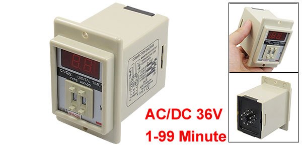 DetailsWhite AC/DC 36V Power on Delay Timer Time Relay 1-999 Minute 8 Pins ASY-2D  Product Name Digital Time Relay Type ASY-2D Rated Voltage AC/DC 36V Frequency 50/60 Hz Contact AC 220V 5A Non-inductive Load Time Range 1-99 Minute Mount Size (Approx.) 49 x 68 x 61mm/ 1.9" x 2.7" x 2.4" (L*W*H) Mount Hole Diameter 4mm/ 0.16" Total Size 57 x 90 x 86mm/2.2" x 3.5" x 3.4"(L*W*H) Color White Net Weight 128g Package Content 1 x Digital Time Relay