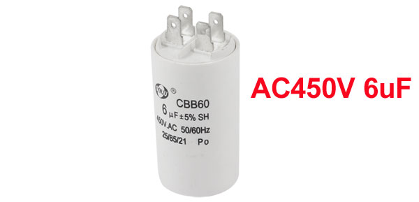 Product Name Motor Capacitor Material Polypropylene Film Model CBB60 Capacitance 6uF Tolerance ±5% Rated Voltage AC 450V Frequency 50/ 60Hz Temperature Coefficient 25/85/21 Body Dimension 6 x 3.5cm/ 2.4" x 1.4"(H*D) Total Length 7cm/ 2.8" Color White Weight 66g Package Content 1 x Motor Capacitor - Reviews