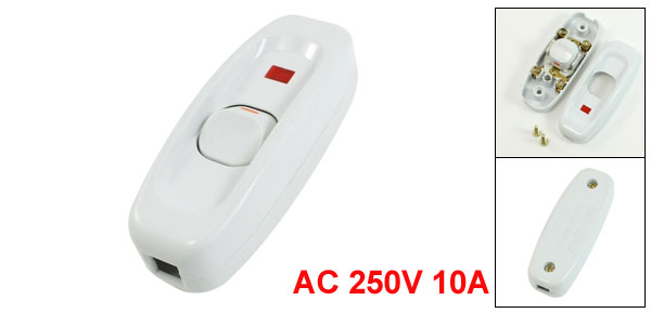 Product Name In Line Cord Switch Rating Power(Max.) AC 250V 10A Contact Type 2 Position Indicator Light Color Red Size 7 x 2.6 x 2cm/ 2.8" x 1" x 0.8"(L*W*H) Color White, Red Materials Plastic, Electric Parts Weight 21g Package Content 1 x In Line Cord Switch - Reviews