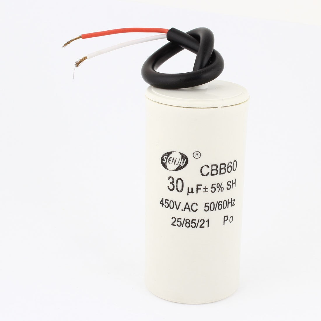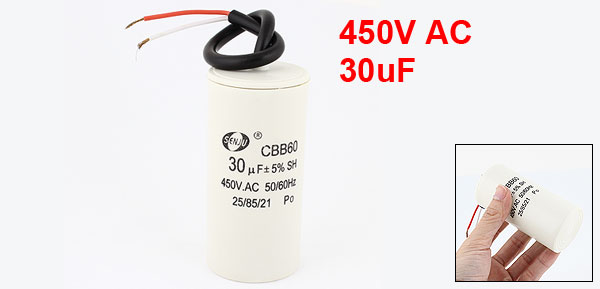 Product Name Motor Capacitor Housing Material Plastic Dielectric Material Metallized Polypropylene Film Model CBB60 Capacitance 30uF Tolerance +/-5% Rated Voltage 450VAC Frequency 50/60Hz Operating Temperature 25/85/21 Body Size 4.3 x 9.2cm / 1.7" x 3.6" (D * H) Wire Length 19cm / 7.5" Color White, Black Weight 160g Package Content 1 x Motor Capacitor - Reviews