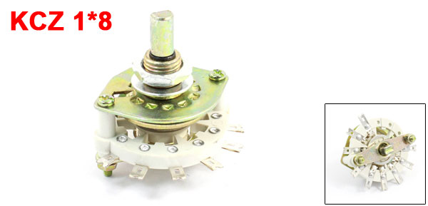 Product Name Rotary Switch Model KCZ 1*8 Material Metal, Ceramic Dimensions(knob not included) 42 x 21mm / 1.65" x 0.83"(Max.D*H) Knob Size 6 x10mm/ 0.24" x 0.39"(D*L) Fit Mounting Hole Diameter 10mm / 0.39" Total Height 46mm/1.8" Pin Number 9 Contact Type 1P8T Color White, Bronze Tone Weight 45g Package Content 1 x Rotary Switch - Reviews