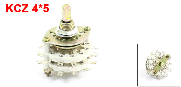 Product Name Rotary Switch Model KCZ 4*5 Material Metal, Ceramic Dimensions(knob not included) 42 x 28mm / 1.65" x 1.1"(Max.D*H) Knob Size 6 x10mm/ 0.24" x 0.39"(D*L) Fit Mounting Hole Diameter 10mm / 0.39" Total Height 49mm/1.9" Pin Number 12 Contact Type 4P5T Color White, Bronze Tone Weight 45g Package Content 1 x Rotary Switch - Reviews