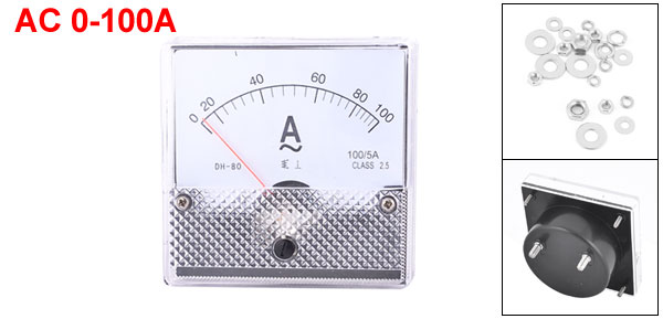 AC Current Panel Meter Model No. DH-80 Scale Range AC 0-100A Accuracy Class 2.5 Back Screw Diameter 3mm/ 0.12", 4mm/ 0.16" Panel Size 8 x 8 x 1.4cm/3.1" x 3.1" x 0.55" (L*W*T) Overall Depth 5cm/ 2" Color Clear, White, Black Main Material Plastic & Metal Weight 80g Package 1 x AC Current Panel Meter - Reviews