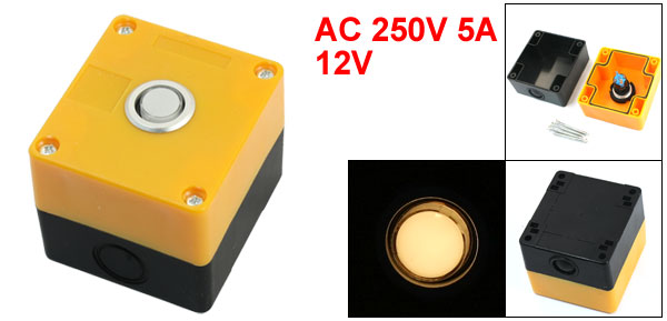 Product Name Push Button Station Action Type Latching Hole Diameter 22mm/ 0.87" Ith 5A/AC 220V Push Button Rating AC 250V 5A Lamp Voltage 12V Lamp Color Warm White Contact Type SPDT( 1 NO 1 NC) Box Size 78 x 71 x 65mm/3" x 2.8" x 2.5" (L*W*H) Button Dia 16mm/0.6" Mounting Hole Diameter 5mm/ 0.2" Mounting Hole Center Distance 64 x 58mm/2.5" x 1.5"(L*W) External Material Plastic External Color Black, Yellow, White Net Weight 123g Package Content 1 x Push Button Station
