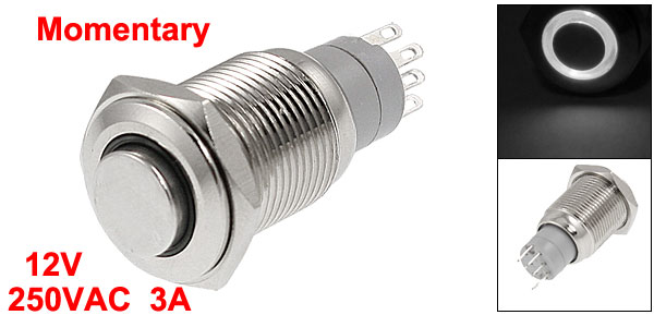 Item Name Stainless Push Button Switch Operation Type Momentary LED Type Ring-illuminated LED Head Shape High Flat Head Contact 1NO 1NC; 2NO 2NC Switch Rating 250VAC, 3A Light Voltage 12V LED Color White Pin Number 5 Thread Diameter 16mm/0.63'' Total Size 38 x 19mm/1.5'' x 0.75''(L*Max.W) Material Stainless, Electric Parts Housing Color Silver Tone Net Weight 15g Package Content 1 x Stainless Push Button Switch - Reviews
