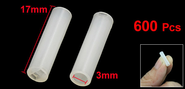 Product Name LED Spacers Inside Diameter 3mm Length 17mm Total Size 17 x 4mm/ 21/32" x 5/32" (H*D) Material Nylon Color White Net Weight 87g Package Content 600(±2%) x LED Spacers - Reviews