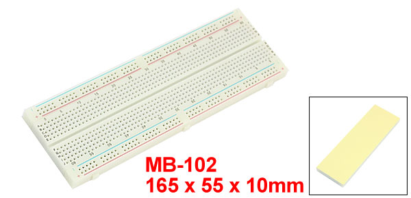 Product Name Solderless Breadboard Model MB-102 Color White Size 165 x 55 x 10mm / 6.5" x 2.2" x 0.4" (L*W*T) Main Material Plastic, Electronic Components Connector Aquantity 820 Pcs Net Weight 90g Package Content 1 x Solderless Breadboard - Reviews