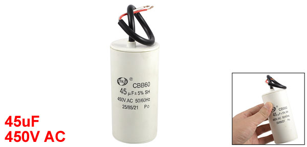 Product Name Motor Capacitor Housing Material Plastic Dielectric Material Polypropylene Model CBB60 Capacitance 45uF Tolerance ±5% Rated Voltage 450VAC Frequency 50/60Hz Body Size 4.8 x 10.4cm / 1.9" x 4.1" (D * H) Wire Size(Approx.) 20 x 0.6cm / 7.9" x 0.24" (L * Max.D) Color White, Black Weight 219g Package Content 1 x Motor Capacitor - Reviews