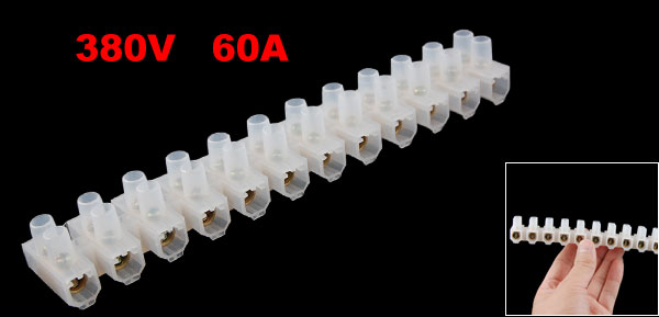 Product Name Terminal Block Material(external) Plastic Color White Type 12 Postion, Dual Row Rated Value 380V, 60A Connector Diameter 6mm/0.24'' Size 177 x 26 x 23mm/7'' x 1'' x 0.9'' (L*W*H) Weight 69g Package Content 1 x Terminal Block - Reviews
