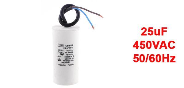 Product Name Motor Capacitor Housing Material Plastic Dielectric Material Metallized Polypropylene Film Model CBB60 Capacitance 25uF Tolerance ±5% Rated Voltage 450VAC Frequency 50/60Hz Body Size 4.4 x 9.2cm / 1.7" x 3.6" (D * H) Wire Length 17.5cm / 6.9" Color White, Black Weight 65g Package Content 1 x Motor Capacitor - Reviews