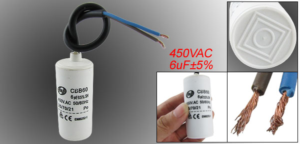 Product Name Motor Capacitor Housing Material Plastic Dielectric Material Metallized Polypropylene Film Model CBB60 Capacitance 6uF Tolerance ±5% Rated Voltage 450VAC Frequency 50/60Hz Body Size 2.8 x 6.5cm/1.1" x 2.5"(D * H) Wire Size(Approx.) 18 x 0.6cm /7" x 0.23" (L * Max.D) Color As Picture Shown Weight 58g Package Content 1 x Motor Capacitor - Reviews