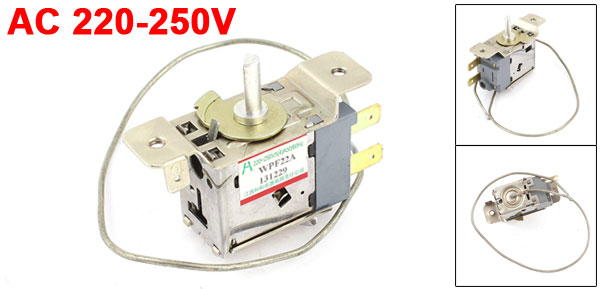 Product Name Refrigerator Thermostat Model No. WPF22A Power AC 220-250V 5(4)A 50/60Hz Body Size(Approx.) 6.8 x 5.5 x 2.4cm/ 2.7" x 2.2" x 0.94"(L*W*T) Shaft Diameter 6mm/ 0.24" Cord Length(Approx.) 30cm/ 12" Material Metal, Plastic Color Silver Tone, Gold Tone, Gray Net Weight 58g Package 1 x Refrigerator Thermostat