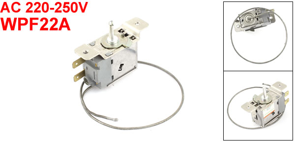 Product Name Refrigerator Thermostat Model No. WPF22A Power AC 220-250V 5(4)A 50/60Hz Body Size(Approx.) 6.8 x 5 x 2.2cm/ 2.7" x 2" x 0.87"(L*W*T) Shaft Diameter 6mm/ 0.24" Cord Length(Approx.) 35cm/ 14" Material Metal, Plastic Color Silver Tone, Gold Tone, Gray Net Weight 57g Package 1 x Refrigerator Thermostat