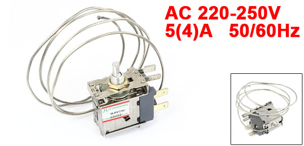 Product Name Refrigerator Thermostat Model No. WPF22G Power AC 220-250V 5(4)A 50/60Hz Body Size(Approx.) 7 x 5 x 2.5cm/ 2.7" x 2" x 1"(L*W*T) Shaft Diameter 6mm/ 0.24" Cord Length(Approx.) 60cm/ 24" Material Metal, Plastic Color Silver Tone, Gold Tone, Gray Net Weight 78g Package 1 x Refrigerator Thermostat