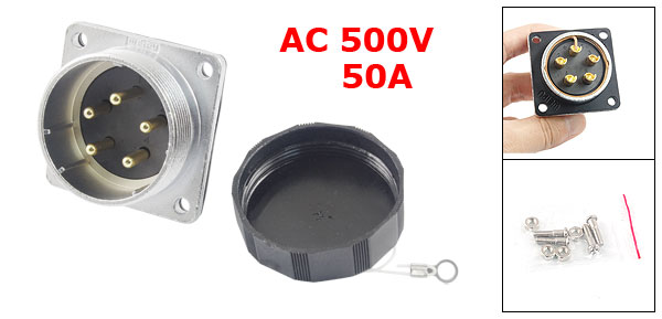 Product Name Chassis Mount Connector Model WS40-5 Working Voltage AC 500V Rated Current 50A Withstand Voltage AC 1500V Contact Resistance 0.5 MOhm Insulator Resistance 2000 MOhm Contacts Pin Number 5 Contacts Pin Diameter 3.5mm/0.1'' Thread Dia. 43.6mm/1.7'' Screw Mount Dia. 4mm/0.16'' Overall Size 50 x 50 x 40mm/2'' x 2'' x 1.6''(L*W*H)