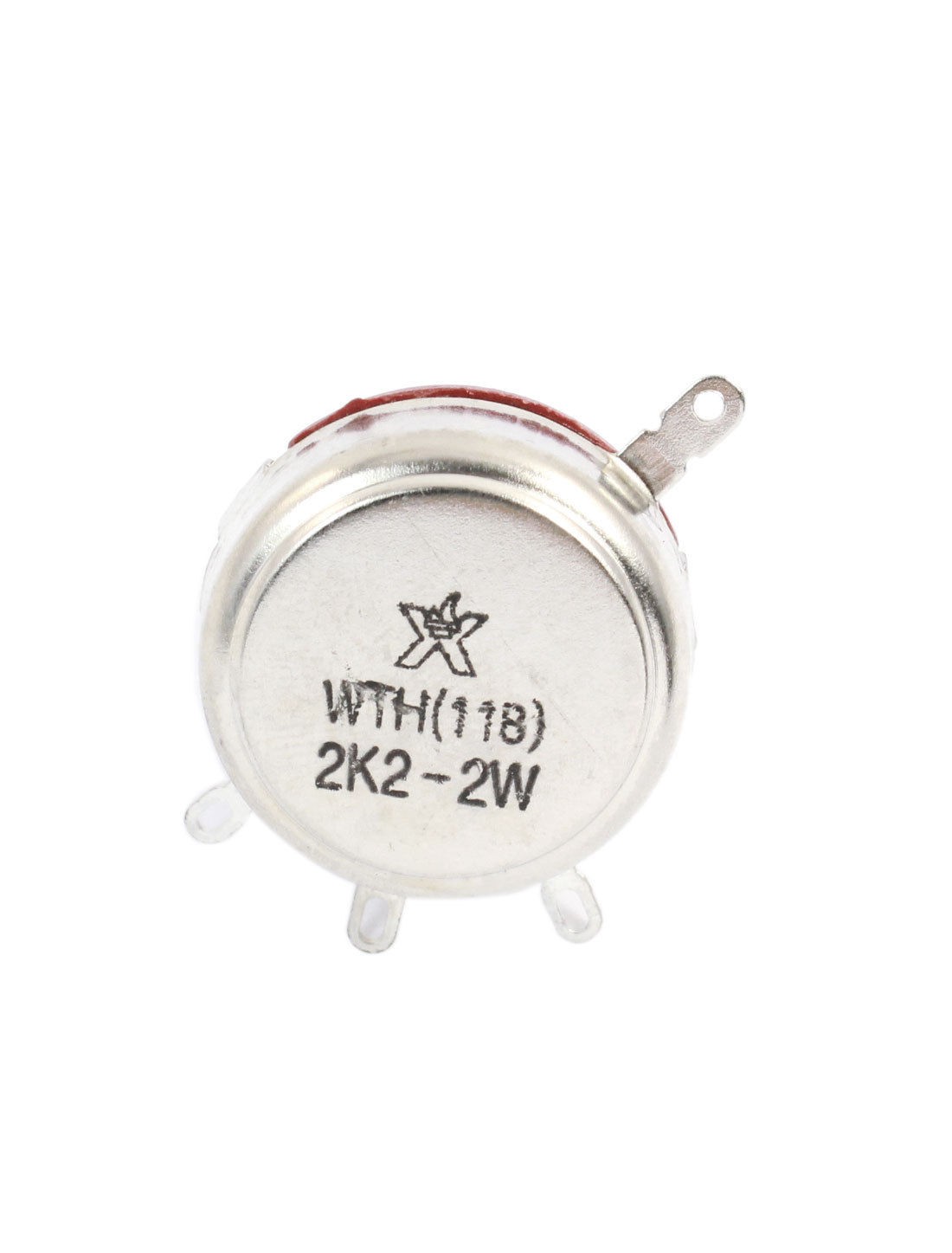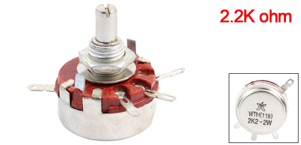 DetailsWTH118 2.2K ohm 2W Watt 6mm Round Shaft 4 Pins Carbon Rotary Potentiometer  Product Name Carbon Potentiometer Model WTH118 Technology Carbon Composition Rated Power 2W Resistance Value 2.2K ohm Turn Number Single Turn Terminals Number 4 Features Round Shaft Body Size 28 x 16mm / 1.1" x 0.63"(D * H) Screw Thread Dia. 10mm / 0.4" Shaft Diameter 6mm / 0.24" Shaft Length 10mm / 0.4" Total Length 35mm / 1.4" Color Red, Silver Tone Net Weight 21g Package Content 1 x Carbon Potentiometer