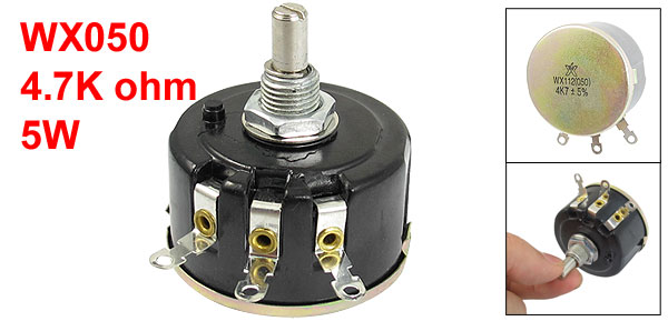 Product Name Wire Wound Potentiometer Model WX050 Type Single Turn Rated Power 5W Resistance Value 4.7K ohm Tolerance 5% Technology Wire Wound Terminals Number 3 Body Size 43 x 25mm / 1.7" x 1"(D * H) Screw Thread Dia. 10mm / 0.4" Shaft Diameter 6mm / 0.24" Shaft Length 10mm / 0.4" Total Length 46mm / 1.8" Color Black, Silver Tone Net Weight 40g Package Content 1 x Carbon Potentiometer - Reviews