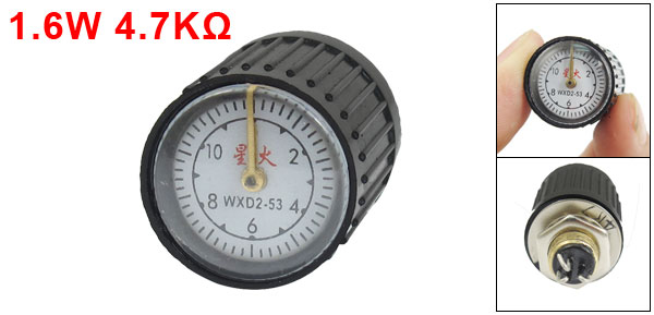 Product Name Wire Wound Potentiometer Model WXD2-53 Type Multiturn Technology Wire Wound Terminal 3 J Shape Terminals Rated Power 1.6W Resistance Value 4.7K ohm Tolerance 5% Body Size 25 x 20mm / 1" x 0.8"(L * D) Screw Thread Dia. 10mm / 0.4" Total Length 40mm/ 1.6" Color Black, Silver Tone Net Weight 16g Package Content 1 x Wire Wound Potentiometer - Reviews