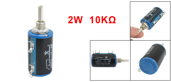 DetailsWXD3-13 10K ohm 2W 4mm Round Shaft Rotary Wire Wound Potentiometer  Product Name Wire Wound Potentiometer Model WXD3-13 Type Multiturn Technology Wire Wound Terminal Number 5 Rated Power 2W Resistance Value 10K ohm Tolerance 5% Body Size 37 x 20mm / 1.47" x 1.78"(L * D) Screw Thread Dia. 7.8mm / 0.3" Shaft Diameter 4mm / 0.16" Shaft Length 12mm/0.5" Total Length 57mm/ 2.24" Color Black, Blue, Silver Tone Net Weight 22g Package Content 1 x Wire Wound Potentiometer