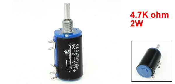 Product Name Wire Wound Potentiometer Model WXD3-13 Type Multiturn Technology Wire Wound Terminal Number 5 Rated Power 2W Resistance Value 4.7K ohm Tolerance 5% Body Size 37 x 20mm / 1.47" x 1.78"(L * D) Screw Thread Dia. 8mm / 0.3" Shaft Diameter 4mm / 0.16" Shaft Length 12mm/0.5" Total Length 58mm/ 2.3" Color Black, Blue, Silver Tone Net Weight 20g Package Content 1 x Wire Wound Potentiometer - Reviews