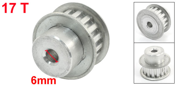 Product Name Timing Pulley Type XL17 Number of Tooth 17T Pitch 5.08mm/1/5'' Bore Diameter 6mm/0.24" Top Diameter 20mm/0.78" Overall Size 31 x 25mm/1.2'' x1''(D*H) Fit Belt Width 11mm/0.43" Materials Alumnum Color Silver Tone Weight 37g Package Content 1 x Timing Pulley - Reviews