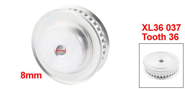 Product Name Timing Pulley Type XL36 037 Tooth Number 36 Pitch 5.08mm/ 0.2" Bore Diameter 8mm / 0.31" Flange 2 Side Lug Diameter 58mm/1.9" Teeth Width 11mm/0.43" Fit Belt Width 9.5mm / 0.37" Overall Size 63 x 25 mm 2.5" x 1" (D*H) Material Aluminum Alloy Color Silver Tone Weight 150g Package Content 1 x Timing Pulley - Reviews
