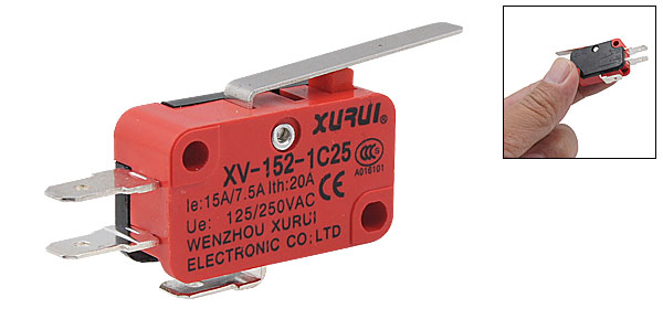 Product Name Micro Switch Model No. XV-152-1C25 Actuator Type Straight Hinge Lever Rating Ue: AC125/250V, Ie: 15A/7.5A, Ith: 20A Contact configuration SPDT Switch Body Size ~2.8 x 1 x 1.6cm / 1.1 x 0.39 x 0.63"(L*W*H) Fixing Holes Dia. ~0.32cm / 0.13“ Button Height ~0.3cm / 0.12" Actuator Size ~2.7 x 0.45cm / 1.06 x 0.18"(L*W) Terminal Blade Width ~0.47cm / 0.19" Material Plastic & Metal Color Red & Silver Tone Net Weight 7g Package Content 1 x Micro Switch - Reviews