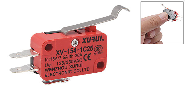 Product Name Micro Switch Model No. XV-154-1C25 Actuator Type Simulated Roller Lever Rating Ue: AC125/250V, Ie: 15A/7.5A, Ith: 20A Contact configuration SPDT Switch Body Size ~2.8 x 1 x 1.6cm / 1.1 x 0.39 x 0.63"(L*W*H) Fixing Holes Dia. ~0.32cm / 0.13" Button Height ~0.3cm / 0.12" Actuator Size ~2.9 x 0.45cm / 1.14 x 0.18"(L*W) Terminal Blade Width ~0.47cm / 0.19" Material Plastic & Metal Color Red & Silver Tone Net Weight 7g Package Content 1 x Micro Switch - Reviews