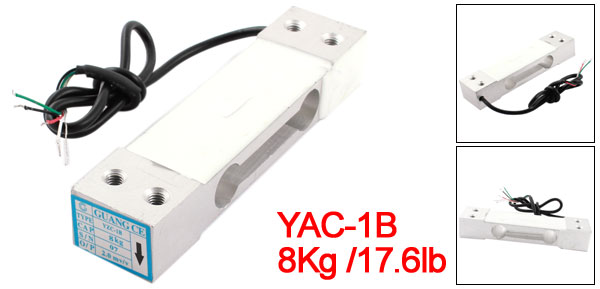 Product Name Load Cell Model YAC-1B Rated Load 8Kg /17.6lb Rated Output 2±0.15mV/V Composition Error ±0.03%RO Input Resistance 402 ± 6Ohm Output Resistance 350± 3 Ohm Insulation Resistance 5000M Ohm(DC 100V) Working Temperature -35°C~+80°C Compensated Temperature Range -10°C~+40°C Safety Overload 150%F.S Excitation Voltage DC 10-15V Total Size 132 x 30 x 22mm /5.2" x 1.2" x 0.87"(L*W*T) Fixing Hole Diameter 5mm / 0.2" Hole Center Distance 106 x 15mm/4" x 0.6"(L*W) Cable Length 430mm/17'' Material Aluminium Alloy Color Silver Tone Weight 166g Package Content 1 x Load Cell - Reviews