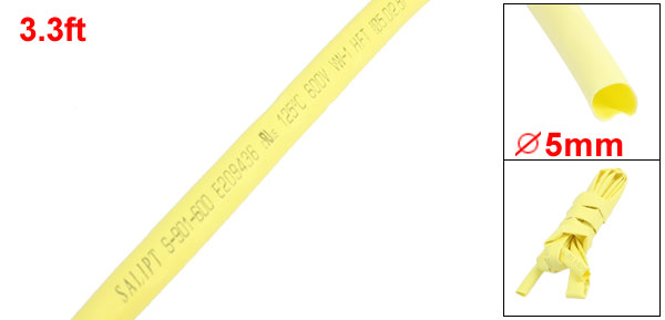 DetailsYellow 5mm Diameter Polyolefin 2:1 Halogen-Free Heat Shrink Tubing 1M 3.3Ft  Product Name Heat Shrink Tube for RC Model Temperature Level 125°C Flammability VW-1 Rating Voltage 600V Diameter 5mm / 0.2" (Before Shrinking) 2.5mm / 0.1" (After Shrinking) Shrink Ratio 2:1 Length (Approx.) 1m/3.3ft Color Yellow Material Polyolefin Weight 8g Package Content 1 x Heat Shrink Tube