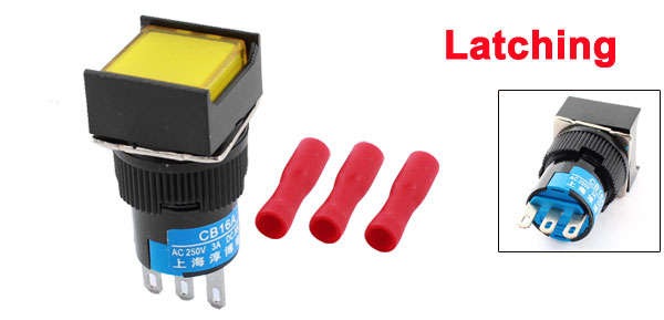Item Name Rectangle Head Push Button Switch w Crimp Connector Model CB16A Contact Type SPDT(1NO 1NC) Action Type Latching Pin Number 3 Voltage, Current AC 250V 3A