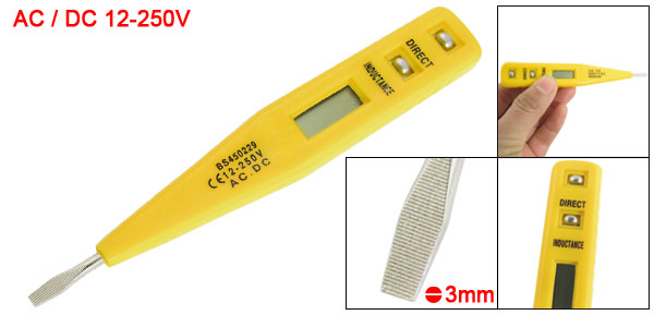 Product Name Digital Voltage Tester Material Plastic, Metal Voltage AC / DC 12-250V Tip Size (Approx.) 3mm / 0.12" Total Size (Approx.) 130mm x 18 x 10mm / 5.1" x 0.7" x 0.4" (L * W * T ) Handle Color Yellow Weight 18g Package Content 1 x Digital Voltage Tester - Reviews