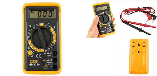 Product Name Digital Multimeter Max Display 1999 ( 3 1/2 Display) AC Voltage (V) 200-600 DC Voltage (V) 200m, 2, 20, 200, 600 AC Current (A) 100µ, 2m, 20m, 200m. 2A Resistance (Ohm) 200, 2k, 20k, 200k, 2M, 20M, 2000M Other Measure Function Diode & On-Off, hFE Overload Protection Fuse Main Color Gray & Orange Mateiral Plastic & Metal Test Leads Total Length ~80cm/ 31.5" Multimeter Size 13.7x 7.5 x 2.5cm/ 5.4" x 3" x 1" (L*W*T) Net Weight 255g