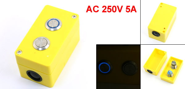 Product Name Push Button Station Action Type Latching Blue Button and Momentary Silver Tone Round Flat Button Contact Type 1NC 1NO Working Voltage & Current 5A 250VAC Max. Withstand Current 19A Light Voltage 24V Light Color Blue Button Dia 2.3cm/0.9" Overall Size 9 x 5 x 5cm/3.5" x 2" x 2"(L*W*H) Wire Hole Dia 20mm/0.78" Mounting Hole Dia 4mm/0.16" Mount Hole Distance 60mm x 35mm/2.4" x 1.4"(L*W) Material Plastic, Metal Color Blue, Yellow, Silver Tone Net Weight 72g Package Content 1 x Push Button Station - Reviews