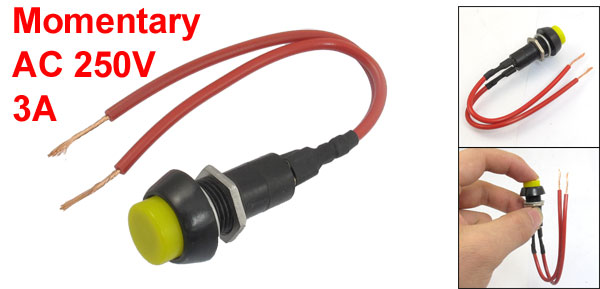 Product Name Wired Push Button Switch Type Momentary Voltage AC 250V Current 3A Color Red, Black, Yellow Material Plastic, Metal, Electronic Parts Size 33 x 18mm / 1.3" x 0.7" (L*Max.D) Mounting Thread Dia. 11mm / 0.43" Cable Length 110mm / 4.3" Weight 9g Package Content 1 x Wired Push Button Switch - Reviews
