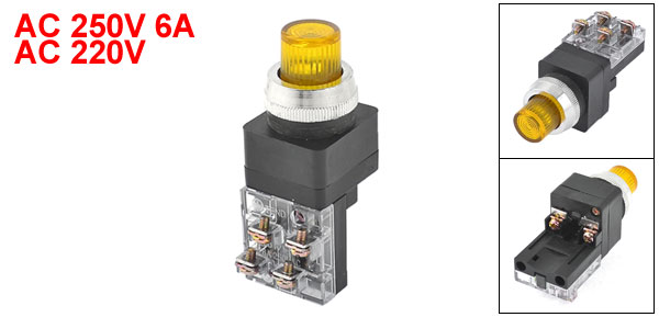Item Name Push Button Switch Action Type Momentary Contact Type 1 NC 1NO(DPST) Lamp Color Yellow Lamp Voltage AC 220V Ith 6A 250VAC Max Voltage 600V Terminals Quantity 6 Size 36 x 32 x 86mm/ 1.4" x 1.25" x 3.4"(L*W*H) Material Plastic, Metal Main Color Black,Yellow Net Weight 59g Package Content 1 x Push Button Switch - Reviews