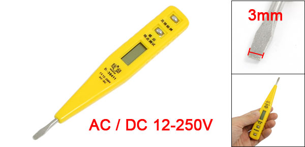 Product Name Digital Voltage Tester Material Plastic, Metal Voltage AC / DC 12-250V Tip Size (Approx.) 3mm / 0.12" Total Size (Approx.) 130 x 20 x 10mm / 5.1" x 0.8" x 0.4" (L * W * T ) Handle Color Yellow Weight 17g Package Content 1 x Digital Voltage Tester - Reviews