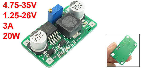 Product Name Step-down Module Model YS-2596 Input Voltage 4.75-35V Output Voltage 1.25-26V Output Rated Current 3A Power 20W PCB Size 47 x 26 x 12mm/ 1.85" x 1.02" x 0.47" (L*W*H) Net Weight 13g Package Content 1 x YS-2596 Step-down Module - Reviews
