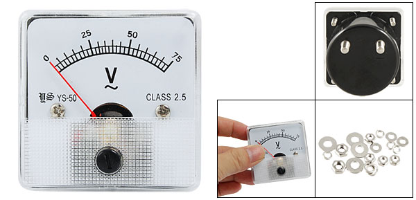 Product Name Analog Voltmeter Model No. YS-50 Measuring Voltage Range AC 0-75V Accuracy Class 2.5 Meter Face Size(Approx) 5 x 5 x 1.1cm / 2" x 2" x 0.4"(L*W*T) Thread Dia(Approx) Big One: 0.38cm / 0.150" Small One: 0.28cm / 0.110" Overall Depth 4.5cm / 1.8" Color Clear & White & Black Material Metal & Plastic Net Weight 59g Package Content 1 x Analog Voltmeter Several Installing Parts - Reviews