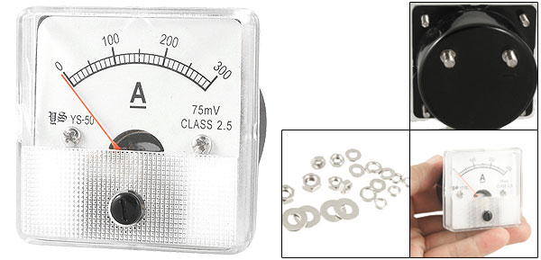 Product Name Analog Ammeter Model No. YS-50 Measuring Current Range DC 0-300A Accuracy Class 2.5 Meter Face Size(Approx) 4.5 x 4.5 x 1cm / 1.8" x 1.8" x 0.4"(L*W*T) Thread Dia(Approx) 0.38cm / 0.150" 0.28cm / 0.110" Overall Depth 4.5cm / 1.8" Color White Material Metal & Plastic Net Weight 55g Package Content 1 x Analog Ammeter Several Installing Parts - Reviews