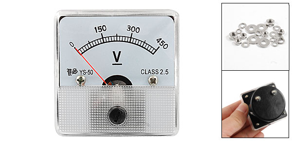 Product Name Analog Voltmeter Model No. YS-50 Measuring Voltage Range DC 0-450V Accuracy Class 2.5 Meter Face Size(Approx) 5.2 x 5.2 x 1.2cm / 2" x 2" x 0.5"(L*W*T) Thread Dia(Approx) 3.85mm/ 0.15"; 2.85mm/ 0.11" Overall Depth 4.3cm / 1.69" Color White, Black Material Metal, Plastic Net Weight 55g Package Content 1 x Analog Voltmeter
