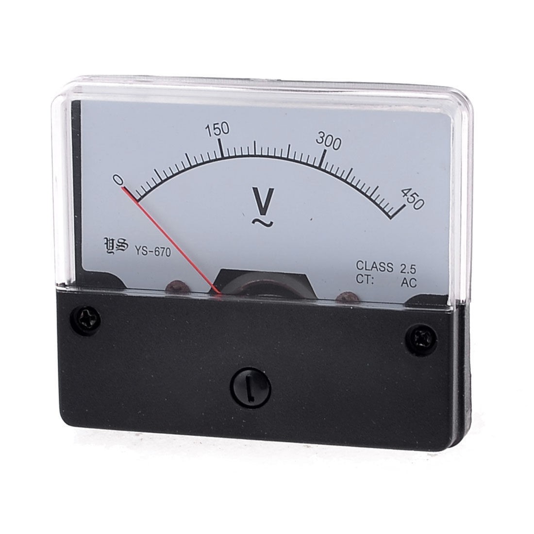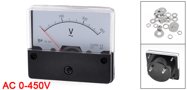 Product Name Analog Voltmeter Model YS-670 Measuring Voltage Range AC 0-450V Accuracy Class 2.5 Meter Face Size(Approx) 7 x 5.8 x 1.2cm/ 2.7" x 2.3" x 0.5"(L*W*T) Thread Size 0.4 x 1cm / 0.15" x 0.4"(D*L) 0.3 x 0.9cm/ 0.11" x 0.35"(D*L) Overall Depth 3.4cm/ 1.3" Color Black, White Net Weight 77g Package Content 1 x Analog Voltmeter Several Installing Parts - Reviews