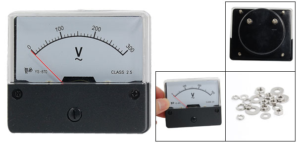 Product Name Analog Voltmeter Model YS-670 Measuring Voltage Range AC 0-300V Accuracy Class 2.5 Meter Face Size(Approx) 7 x 5.8 x 1.2cm/ 2.7" x 2.3" x 0.5"(L*W*T) Thread Size 0.4 x 1cm / 0.15" x 0.4"(D*L) 0.3 x 0.9cm/ 0.11" x 0.35"(D*L) Overall Depth 3.4cm/ 1.3" Color Black, White Net Weight 75g Package Content 1 x Analog Voltmeter Several Installing Parts - Reviews