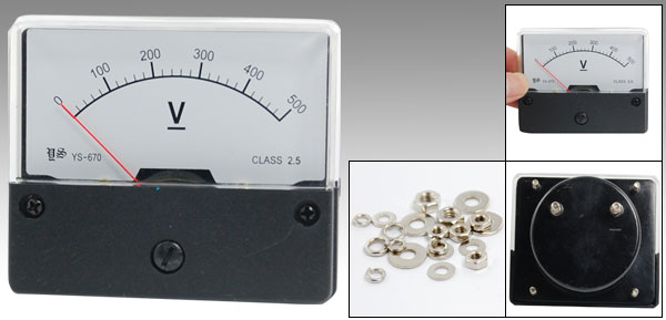 Product Name Analog Voltmeter Model YS-670 Measuring Voltage Range DC 0-500V Accuracy Class 2.5 Meter Face Size(Approx) 7 x 5.8 x 1.2cm/ 2.7" x 2.3" x 0.5"(L*W*T) Thread Size 0.4 x 1cm / 0.15" x 0.4"(D*L) 0.3 x 0.9cm/ 0.11" x 0.35"(D*L) Overall Depth 3.5cm/ 1.4" Color Black, White Net Weight 72g Package Content 1 x Analog Voltmeter Several Installing Parts - Reviews