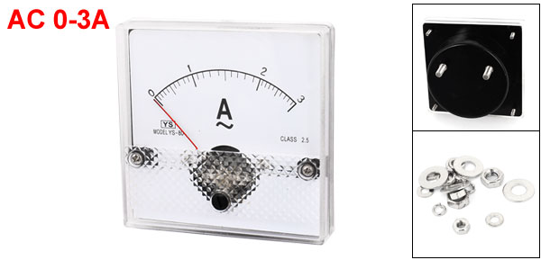 Panel Size 80 x 80 x 13mm/3.1" x 3.1" x 0.5"(L*W*T) Main Color Clear, White, Black Net Weight 130g Total Length 50mm/2" Country of Manufacture CHINA Model YS-80 Package Content 1 x Analog Ammeter, Instal Parts Screw Diameter 5mm/0.2" Material Plastic, Metal Accuracy 2.5 Class Measuring Current Range AC 0-3A - Reviews
