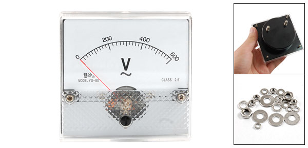 Product Name Analog Voltmeter Model No. YS-80 Measuring Voltage Range AC 0-600V Accuracy Class 2.5 Meter Face Size(Approx) 8.1 x 8.1 x 1.4cm / 3.2" x 3.2" x 0.6"(L*W*T) Thread Dia(Approx) 4.6mm / 0.18", 2.8mm / 0.11" Overall Depth 4.9cm / 1.93" Color Clear, White, Black Material Metal, Plastic Net Weight 100g Package Content 1 x Analog Voltmeter
