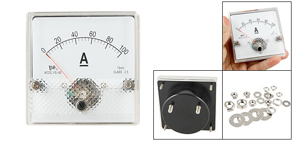 DC Current Panel Meter Model No. YS-80 Scale Range DC 0~100A Accuracy Class 2.5 Back Screw Diameter 5mm/ 0.2" & 3mm/ 0.12" Back Round Base Dia. 64mm/ 2.5" Panel Size 8 x 8 x 1.3cm/ 3.1" x 3.1" x 0.5" (L*W*T) Overall Depth 4.8cm/ 1.9" Color White & Black Main Material Plastic & Metal Net Weight 105g Package 1 x DC Current Panel Meter - Reviews