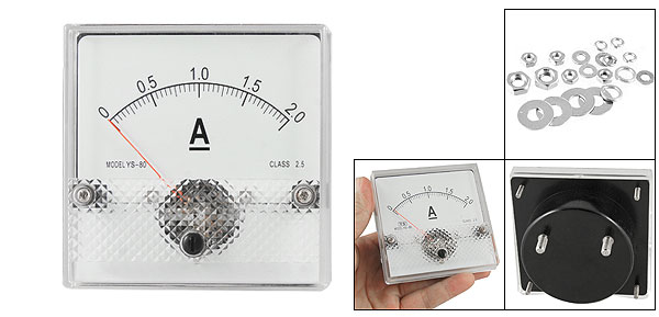 DC Current Panel Meter Model No. YS-80 Scale Range DC 0~2A Accuracy Class 2.5 Back Screw Diameter 5mm/ 0.2" & 3mm/ 0.12" Back Round Base Dia. 64mm/ 2.5" Panel Size 8 x 8 x 1.3cm/ 3.1" x 3.1" x 0.5" (L*W*T) Overall Depth 4.8cm/ 1.9" Color White & Black Main Material Plastic & Metal Net Weight 108g Package 1 x DC Current Panel Meter - Reviews