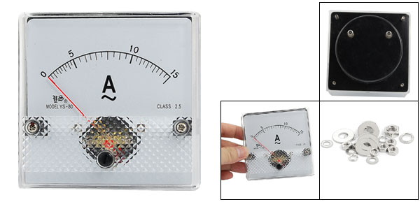 Product Name Analog Ammeter Model YS-80 Measuring Current Range AC 0-15A Accuracy Class 2.5 Meter Face Size(Approx.) 8.2 x 8.2 x 1.3cm / 3.2" x 3.2" x 0.5" (L*W*H) Thread Size 0.2 x 1cm / 0.08" x 0.39" (D*L) 0.4 x 1.4cm / 0.16" x 0.55" (D*L) Total Thickness 5cm / 2" Material Plastic, Electronic Components Color White, Black Net Weight 102g Package Content 1 x Analog Ammeter Installation kits - Reviews